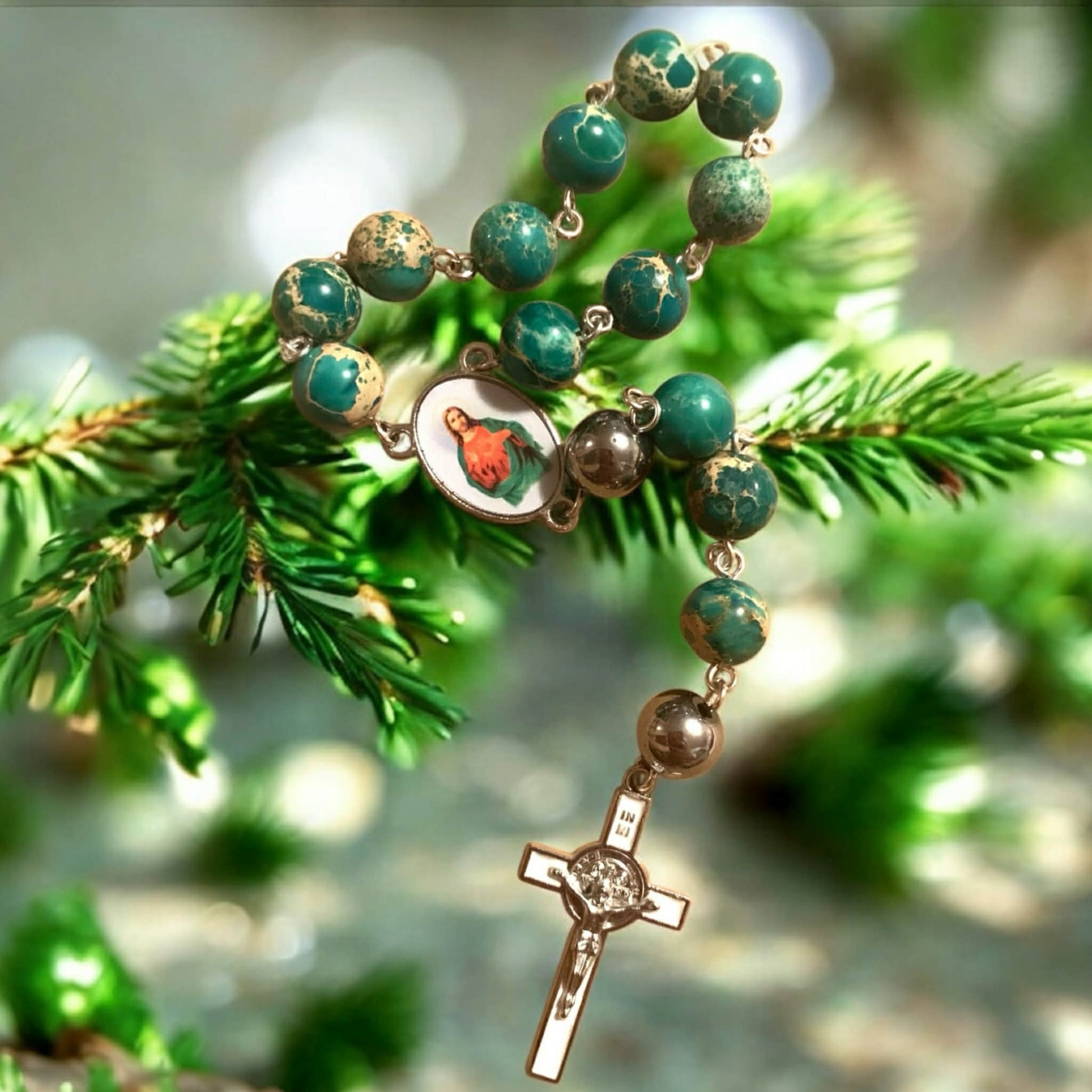 A meaningful pocket rosary created for those who work hard, wait with faith, and trust in God’s perfect timing. Handcrafted with Green Imperial Jasper, each bead shows natural variations and small imperfections—beautiful reminders that just like us, every piece is shaped with purpose by God. Paired with polished silver stainless steel beads, a Sacred Heart centerpiece, and a silver white crucifix, this compact rosary fits easily in your pocket, purse, or prayer pouch—always close when you need strength and assurance.